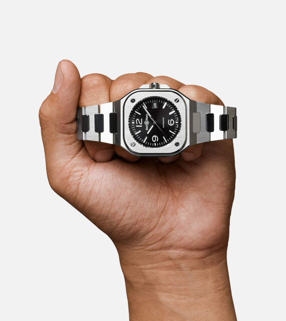 Les lignes du boîtier associent le rond et le carré, figures géométriques fondamentales qui signent l’identité de la marque Bell & Ross. Cette collection urbaine se décline en deux variations : la BR 05, qui dépasse la rigueur du carré et transcende la perfection du cercle pour affirmer sa propre identité, et la BR-X5, équipée d'un mouvement manufacture, qui se présente comme une BR 05 au superlatif. Son boîtier multi-composants privilégie une architecture épurée et radicale, alliant légèreté et résistance.