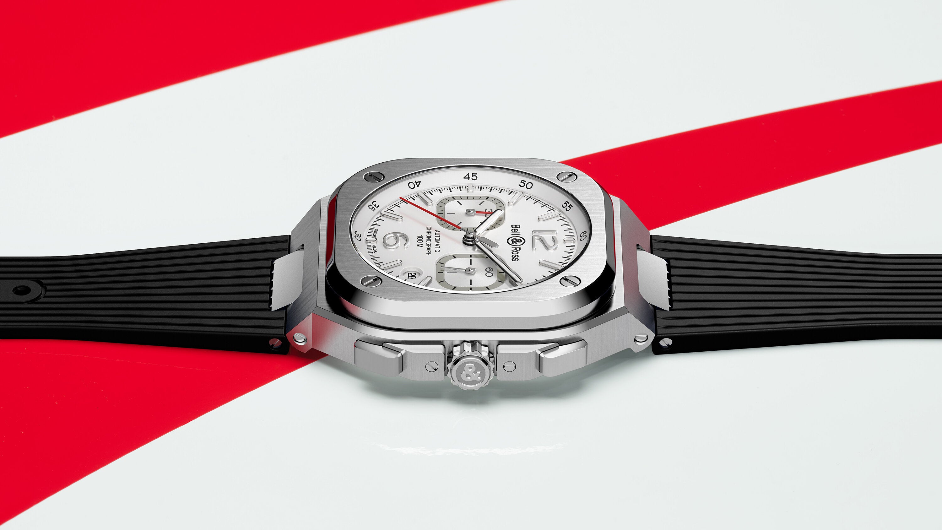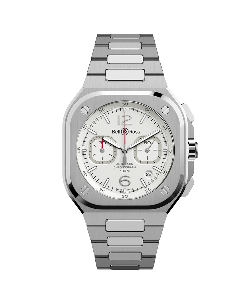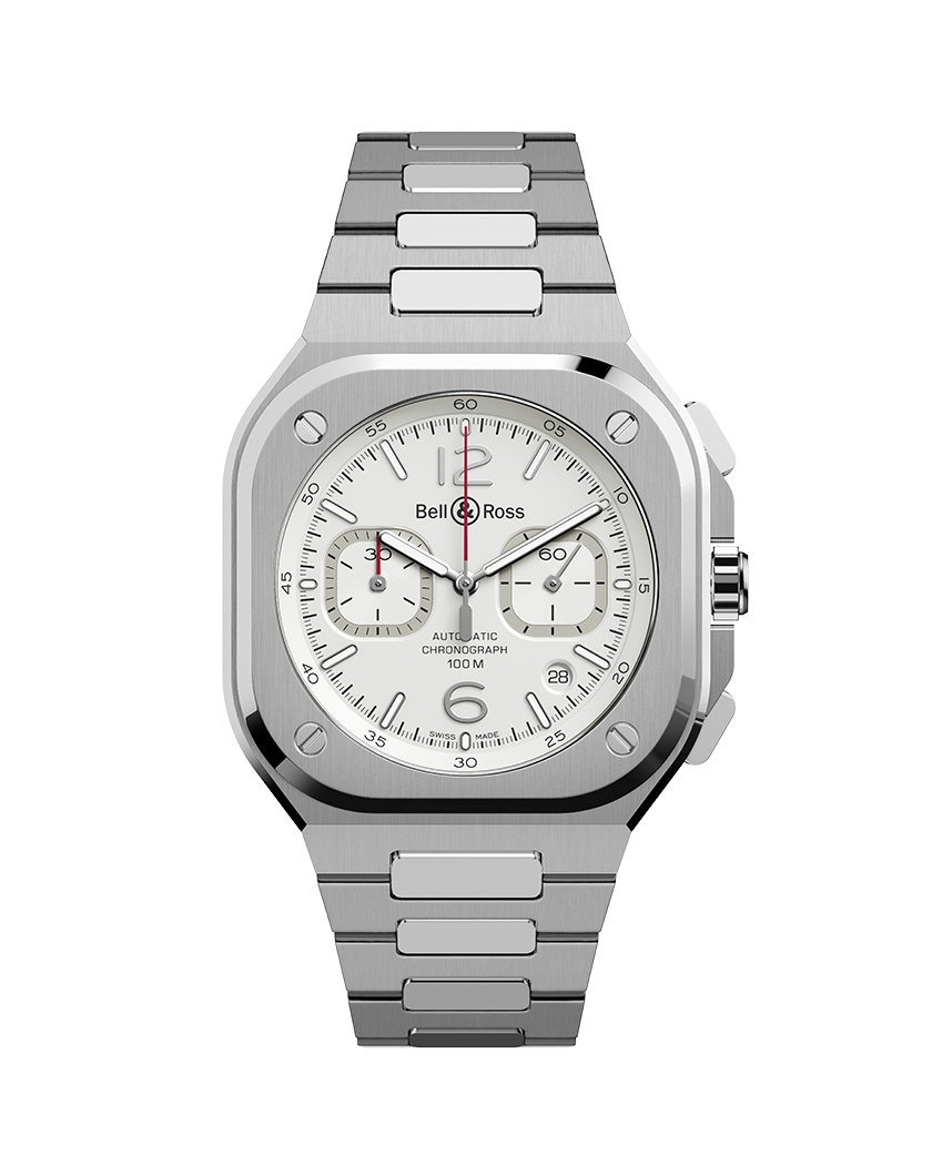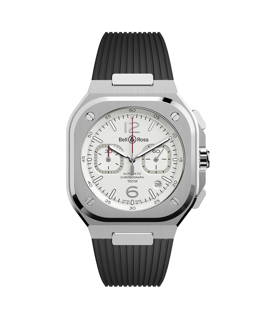 此新作集合Bell & Ross陽剛美學及高級製 錶技術於一身,42毫米錶殼圓方合一, 這 是Bell & Ross青睞的基本幾何形狀,體現 品牌特徵。 黑色及藍色是BR 05系列的代表顏色,繼早 前這兩款顏色的錶盤設計後,筆鋒一轉,柔 和的色調與前者深沉色調來個對比,白色 錶盤層次分明,腕錶修飾造工細緻,散發優 雅純美及雋永氣質。 42毫米腕錶曲線弧度與角度經過特別關 注,確保錶鍊無縫貼合任何手腕。,腕錶可 配優雅緞面打磨及拋光鋼鏈帶或充滿時尚 動感的黑色橡膠帶。