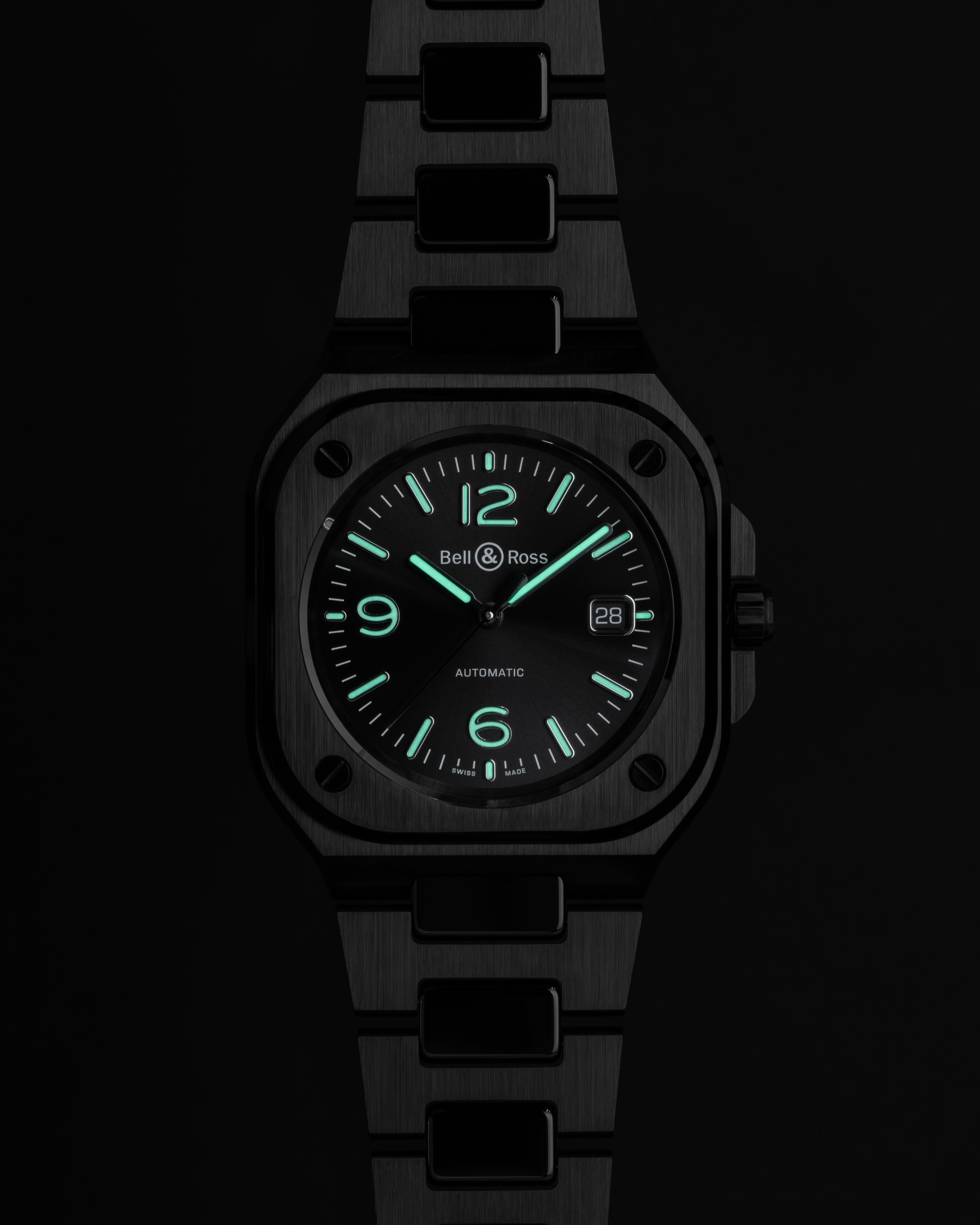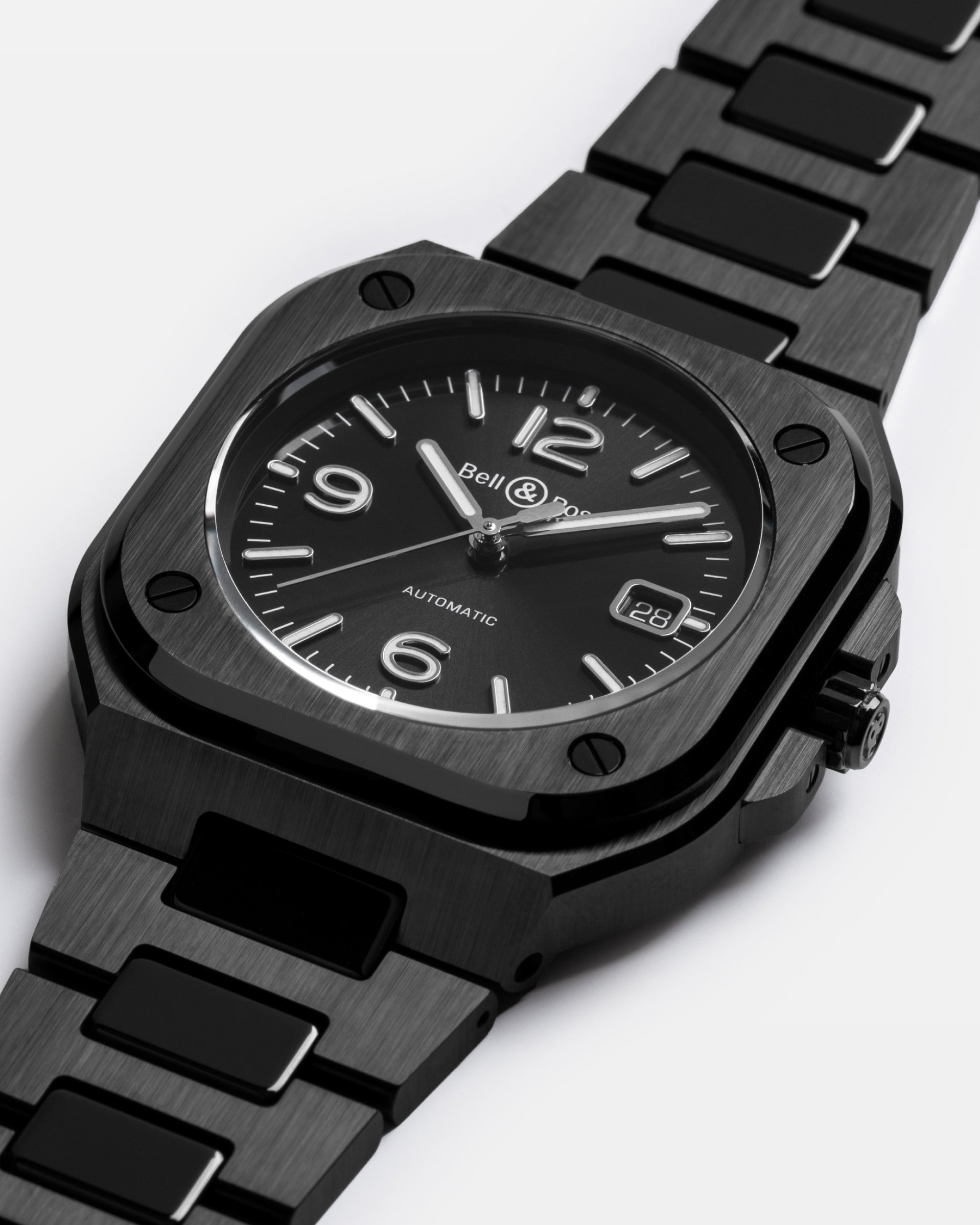黑色會改變我們對大小的感知。為了抵消這種光學效應並突顯腕錶給人的視覺衝擊感,Bell & Ross創意總監兼聯合創始人Bruno Belamich將尺寸稍微加大,從而創造出首款採用41毫米錶殼的BR 05自動上鍊腕錶。