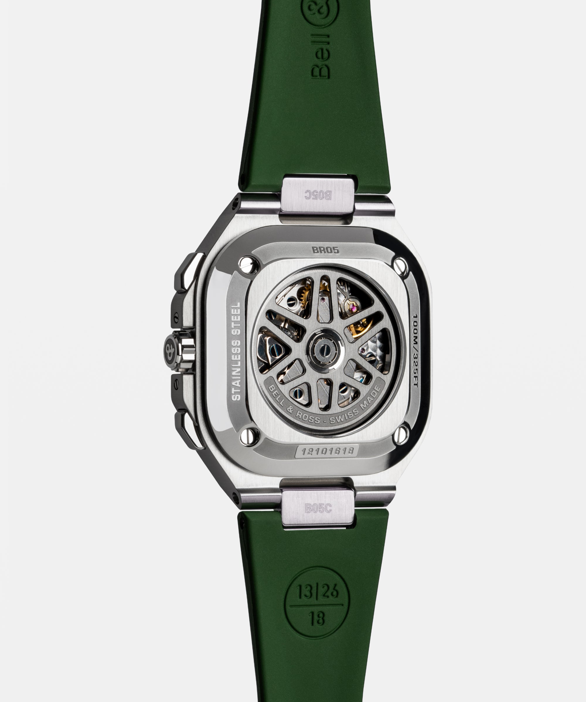 計時碼錶是測量短時間的重要工具,也是航空界最常用的複雜功能。同時,也是運動員與追求活躍生活方式的人士最喜愛的複雜功能。BR-CAL.326機芯為BR-05綠色不鏽鋼計時碼錶帶來堅固、可靠與效率。透過藍寶石錶殼底蓋可將自動盤盡收眼底,其完整而精緻的鏤空設計,正是Bell & Ross自動機芯的招牌標誌。