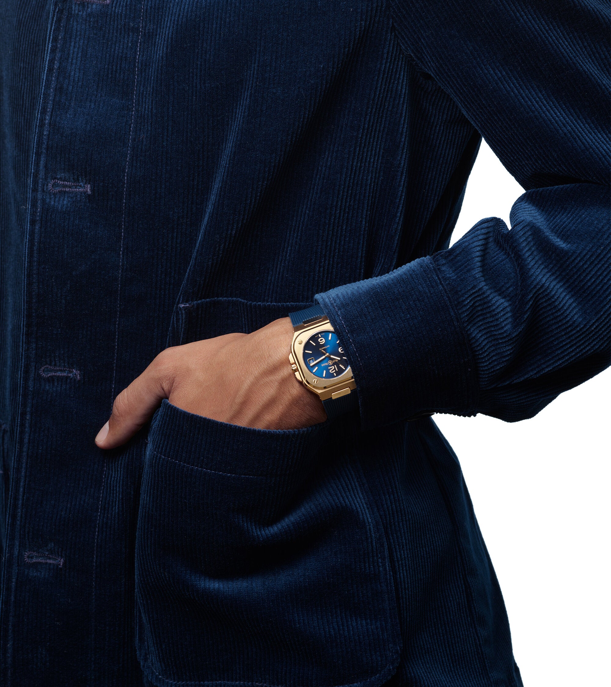 BR-05的方形錶殼已經足以成為經典腕錶,圓形錶盤確保閱時清晰度,同時尺寸大方,又有著功能性設計的效能。BR-05 GOLD BLUE專為都市生活打造,現代又舒適,是都市探索家每日都市生活的珍貴夥伴。色彩與材質的對話,打造了雋永又別具一格的時計。