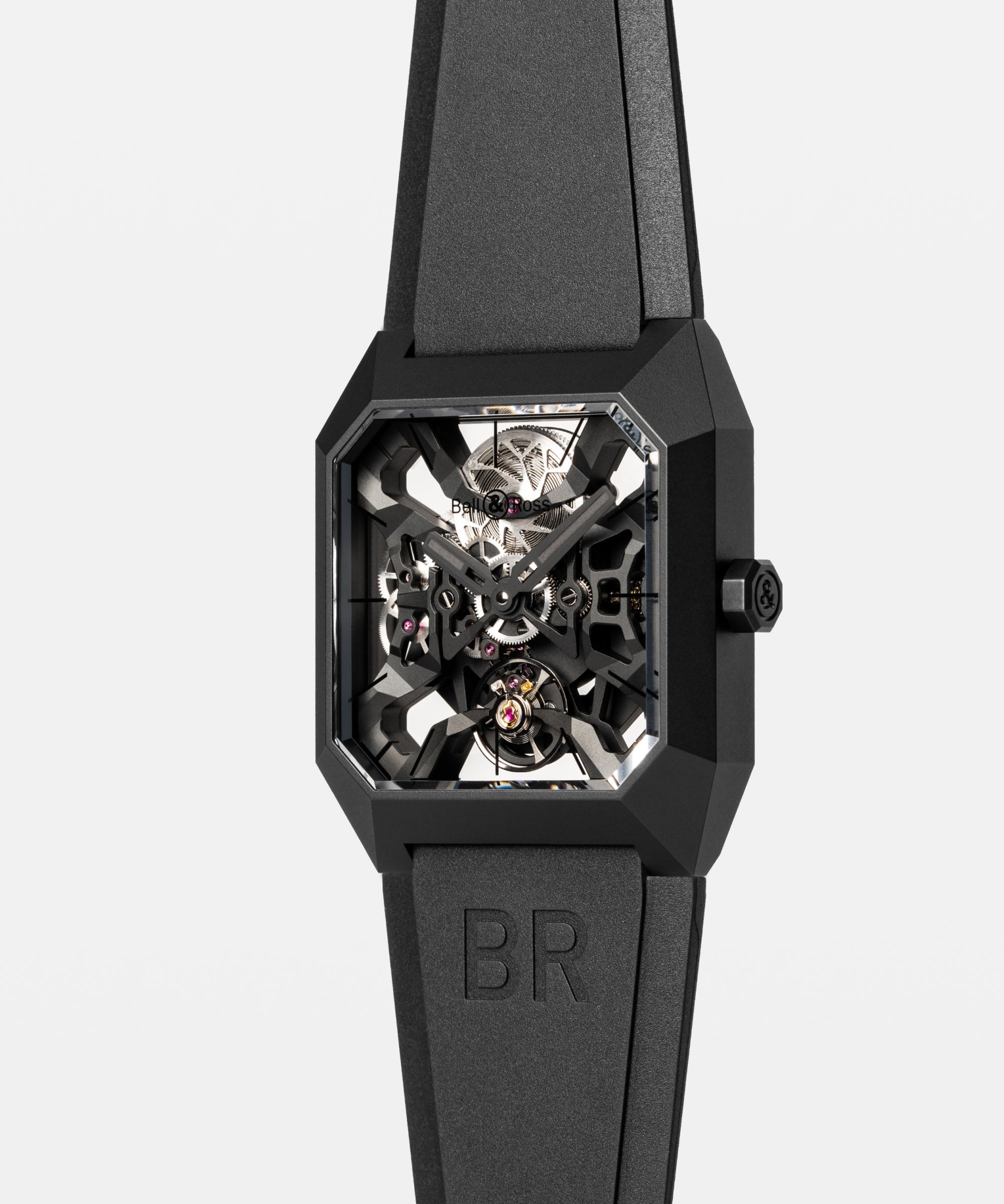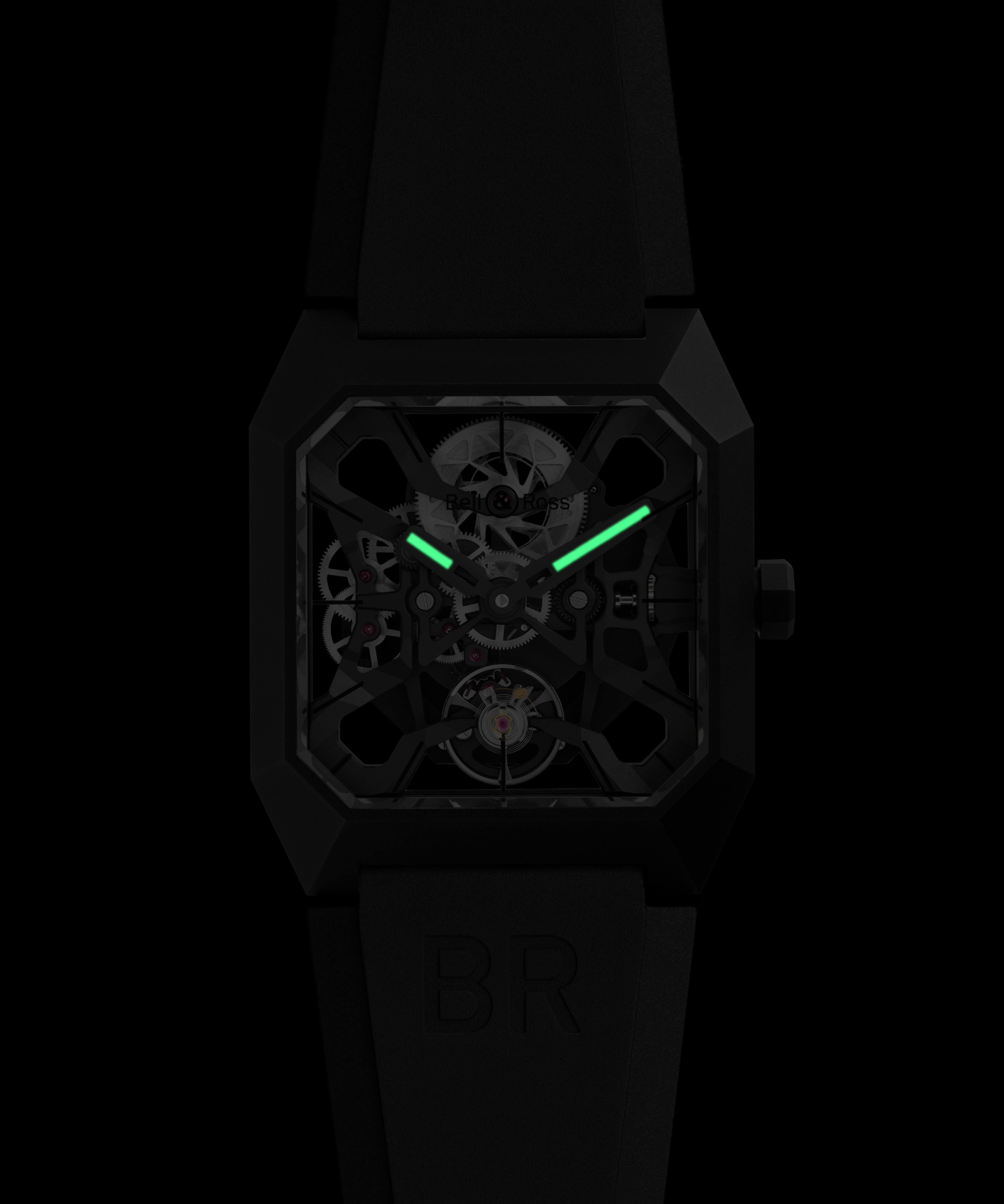 錶盤和主要零件都經過鏤空處理,將藏匿蹤跡的隱形概念提升至全新境界。BR-CAL.383機芯亦藉由其3D立體鏤空設計進行精心改造。