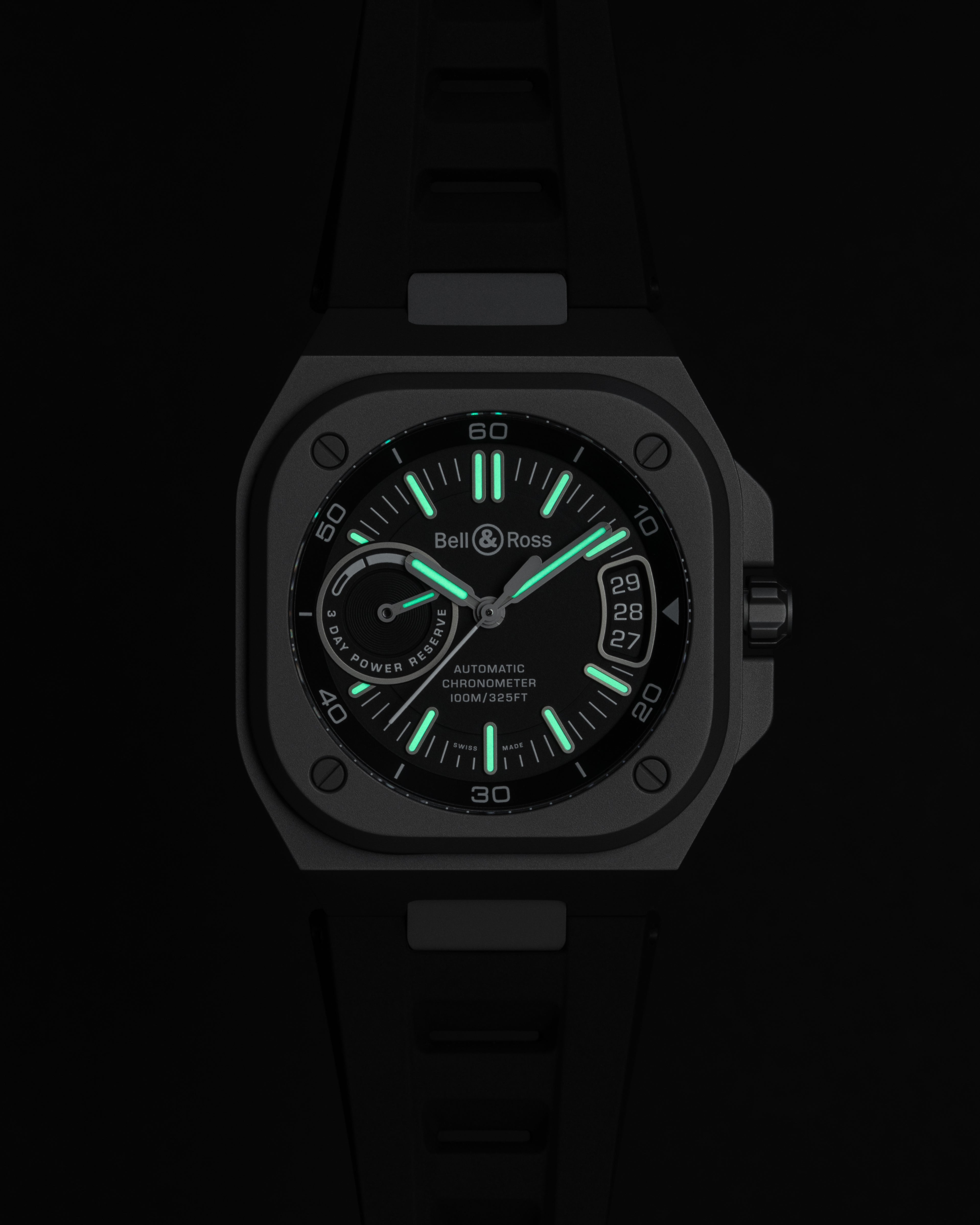 BR-CAL.323機芯獲得COSC精密時計認證,透過錶盤中央的透明玻璃與錶殼底蓋的藍寶石水晶一覽無遺。70小時的動力儲存指示、設計成油量錶的外型,突顯BR-X5 Racing的運動風格。