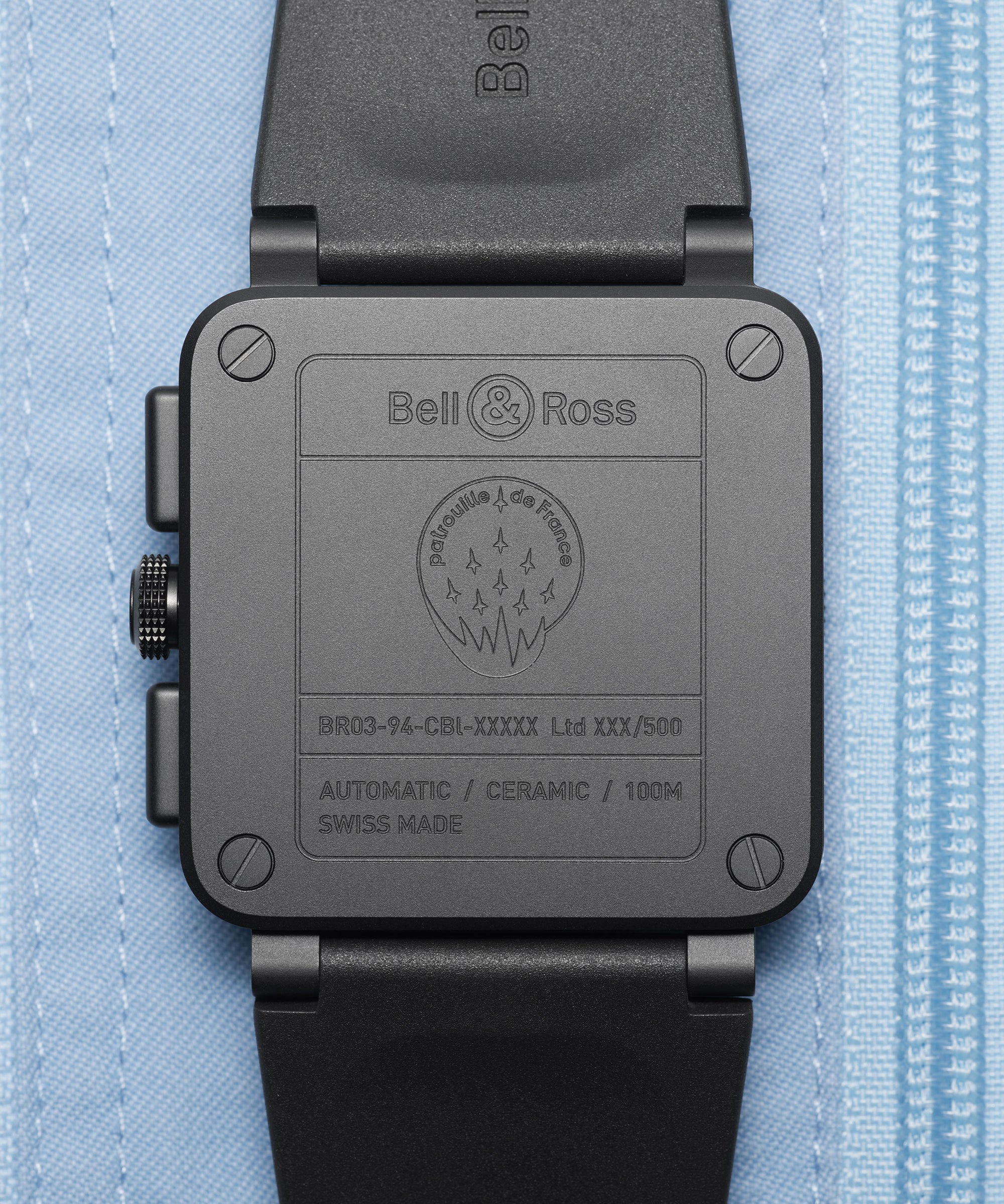In einer Auflage von 500 Stück wird diese limitierte Edition der Öffentlichkeit zugänglich gemacht. Das Zifferblatt derBR 03-94 PATROUILLE DE FRANCE trägt mit Stolz und Eleganz das Abzeichen der Patrouille de France. Der Kreis steht für den Zusammenhalt der Einsatzeinheit und ihre Fähigkeit, alle Aspekte einer Situation zu bewältigen. Das Gold auf dem Hintergrund des Emblems ist eine Farbe, die häufig in militärischen Abzeichen verwendet wird. Die neun Jet-Silhouetten erinnern an neun Fouga Magister (die früheren Flugzeuge der Patrouille de France vor dem Alpha-Jet) und repräsentieren ihre charakteristische Flugschau-Formation, die auch als “Concorde” bekannt ist. Das dreifarbige Banner, das das Logo umhüllt, symbolisiert den französischen Farbnebel und die akrobatischen Evolutionen des fliegenden Teams, dem “Botschafter” der französischen Luftund Raumfahrtkräfte. Dieses Emblem ist mehr als nur ein Logo, es hat einen hohen Symbolgehalt und steht für die Werte, die die Piloten verkörpern: Genauigkeit, Zuverlässigkeit, Disziplin, Kontrolle, aber auch Solidarität und Demut. Durch die Partnerschaft mit der Patrouille de France assoziiert sich Bell & Ross mit diesen Werten und schließt sich ihnen als Botschafter für Exzellenz in der französischen Luftfahrt an. Das Logo der Patrouille de France ist unten auf dem Zifferblatt aufgedruckt und auch auf dem Gehäuseboden eingraviert.