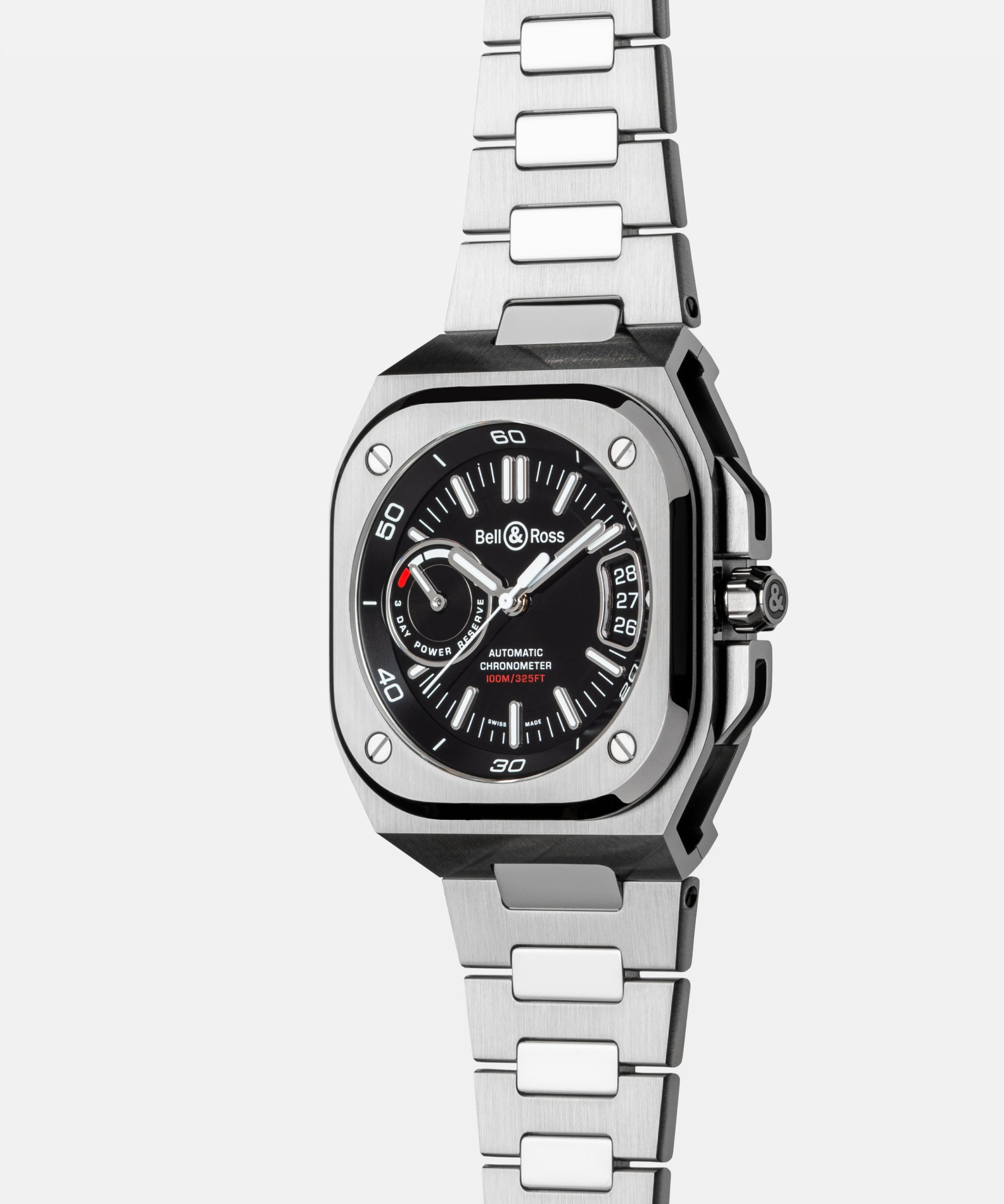 The BR‑X5 stands out from the BR-05 by its movement and its functions which are displayed in the dial. The latter features a large-aperture date window positioned at 3 o’clock and a circle-shaped power reserve indicator at 9 o’clock. The latter, divided into three thirds, allows you to control the autonomy of your watch. These features give the BR‑X5 a new face and its visual identity.