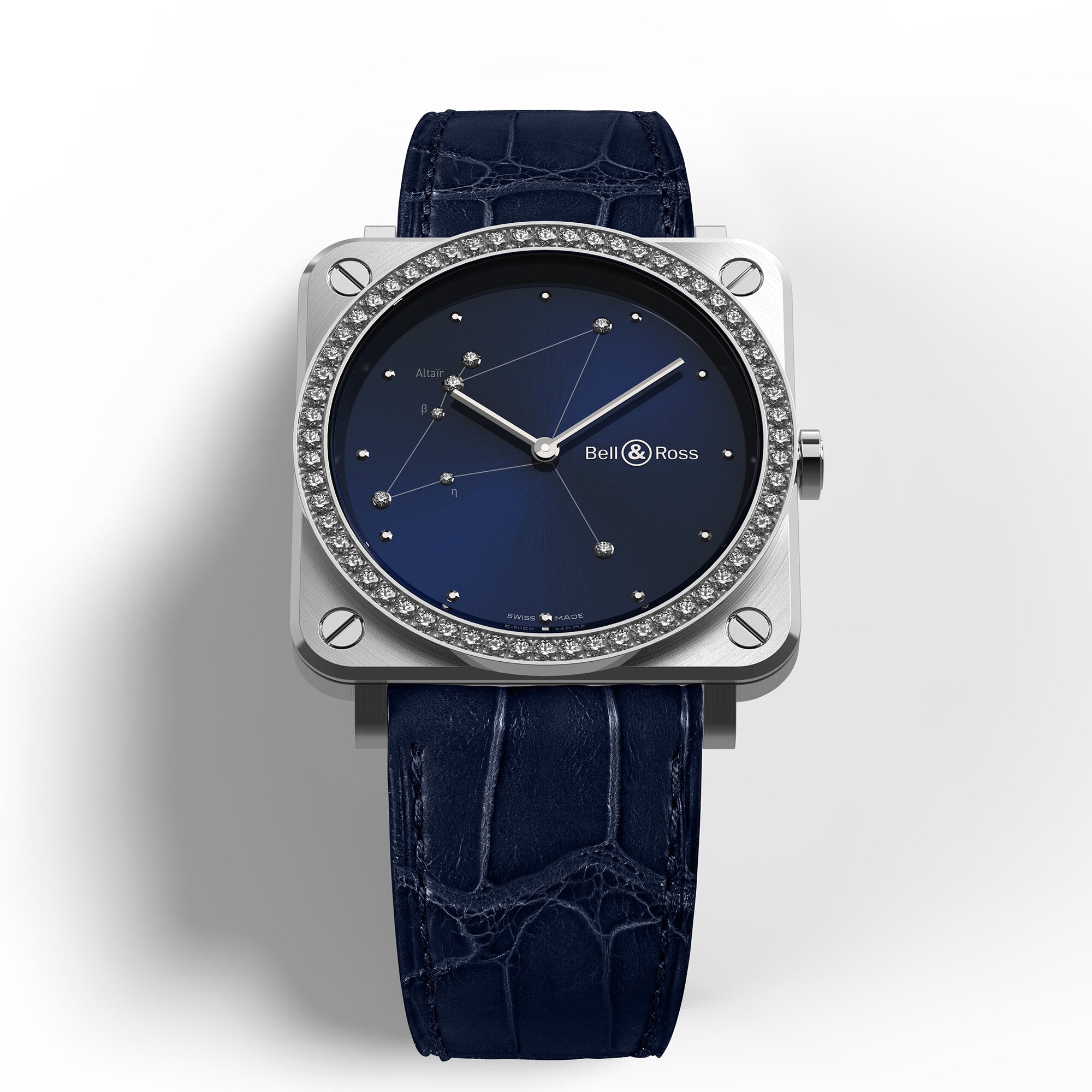 The stones are set into the dial in the pattern of the Aquila constellation, named for Jupiter’s eagle. This legendary cluster of stars is easily visible from the earth.The size of the diamonds and their brilliance is a perfect rendering of this celestial group. Bell & Ross wished to lend its watch the spectacular strength of the eagle, a legendary bird that soars to symbolic heights. These include its association with Jupiter, god of the sky.