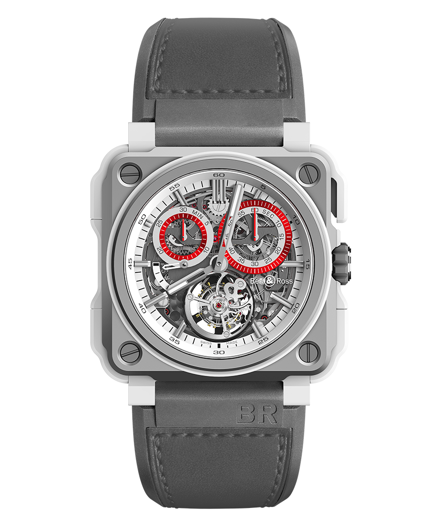 Movement : BR-CAL.283. Hand-wound flying tourbillon. Monopusher column-wheel chronograph. 282 components, 35 jewels, 21,600 vph. 4-day power reserve.