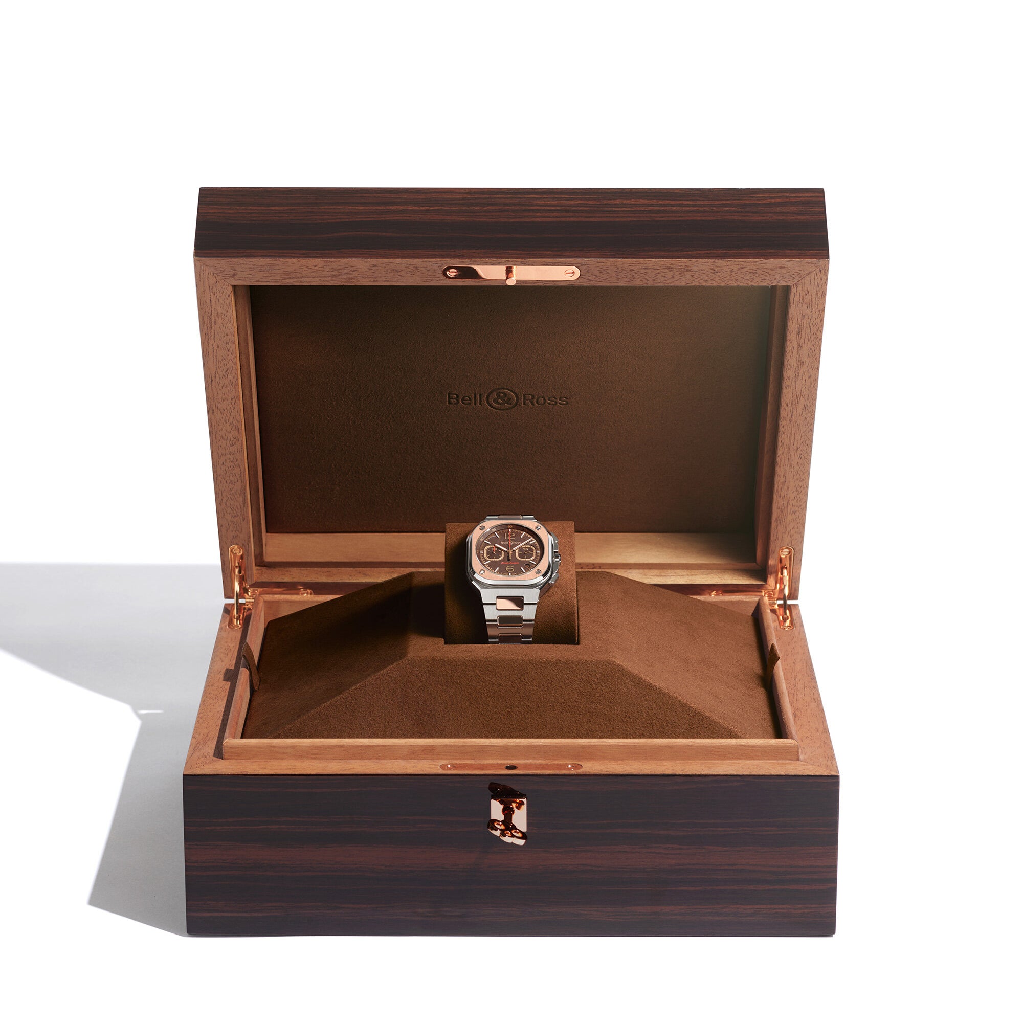 Este reloj de coleccionista se entrega en una espectacular caja de madera de lujo. El logotipo de Bell & Ross está grabado en su tapa en forma de anillo de puro en acero dorado y oro 5N. El elegante estuche está adornado con ébano barnizado en el exterior y madera de cedro en el interior. El estuche, que es una hermosa pieza por sí misma, está diseñado para convertirse fácilmente en una auténtica caja de puros.