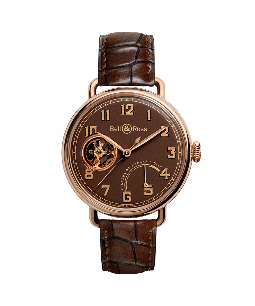Mouvement : BR-CAL.202. mécanique à remontage manuel. 34 rubis, 28'800 Alt/h. Mouvement à double barillet offrant une réserve de marche de 5 jours. Ponts anglés finition côtes de Genève centré sur le balancier. Vis bleues.