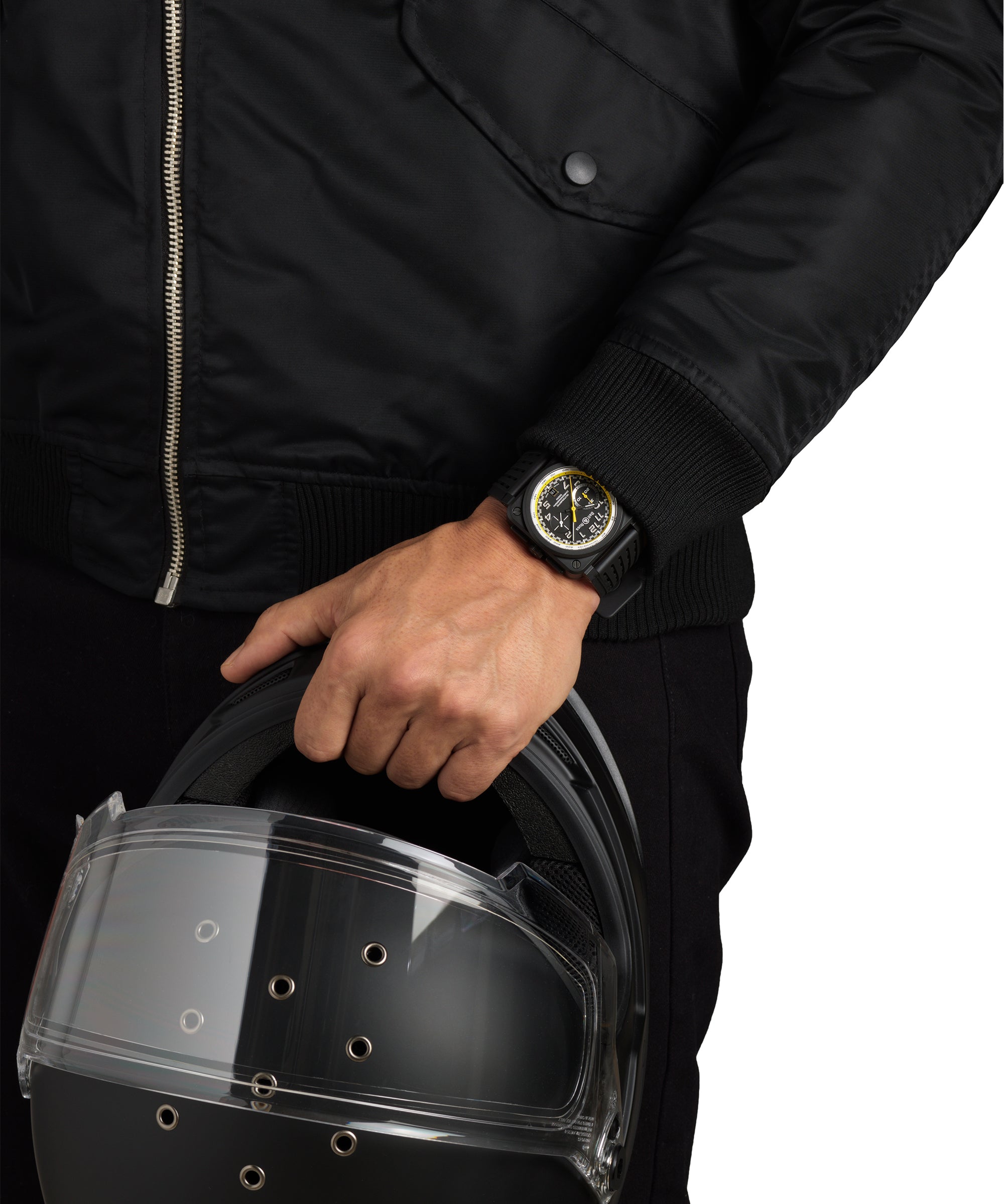 Dial : Matte black. Applied numerals filled with Super-LumiNova®. Skeletonized metal hour and minute hands filled with Super-LumiNova®.