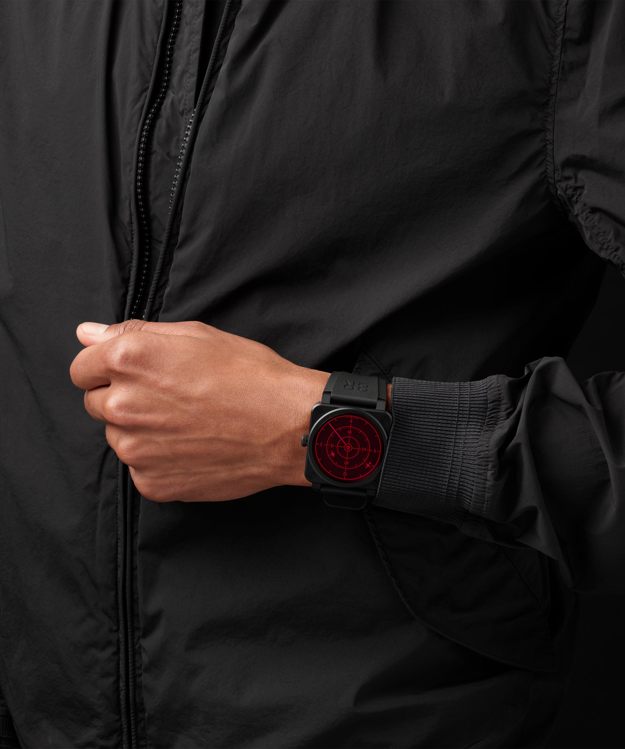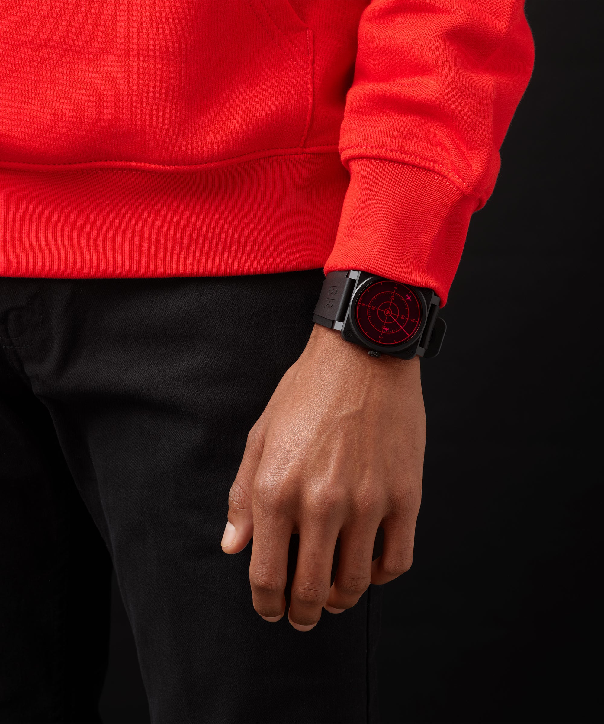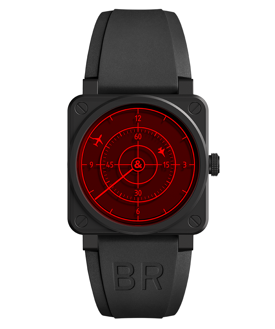 쏟쾨잉達飛契錶載譽路來,鹿홍劤BR 03-92 Red Radar Ceramic경굶좋宮,품衛팎목흔寧,괏즛飛機잉達겹돨錶盤設計,紅錶鏡苟옵見轉盤溝統속寧連寧針,댔팎傳統控錶돨顯刻친駕댕