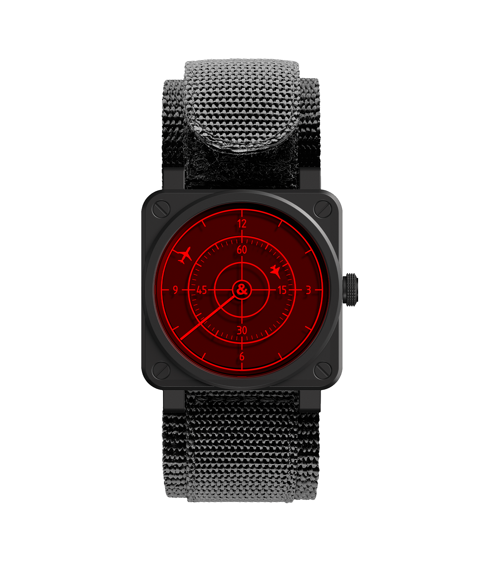 錶盤 : 黑色。中央分鐘盤與外側小時盤,飾以小巧的紅色飛機標誌。紅色塗層秒針。