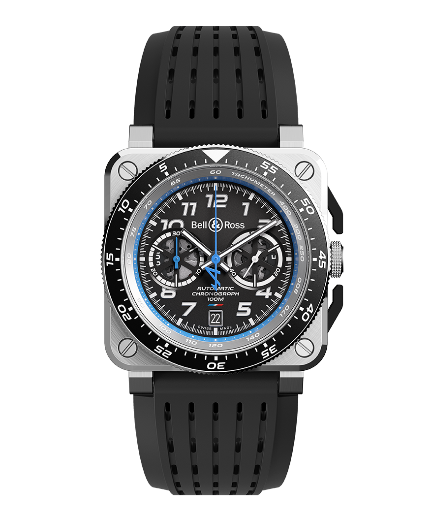 功能 : 時、分、3 時位置にスモールセコンド、日付。クロノグラフ:9 時位置に 30 分カウンター、センターにクロノグラフ秒針。フランジにタキメーター目盛り。
